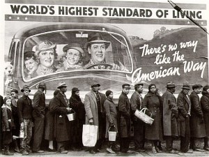 Leaving Cert (LC from now on!) think about the impact of this picture: the framing and contrast between the “shiny happy people” depicted enjoying the “American Way” and the stark reality of the bread line in front. Does it make a difference being in black and white rather than colour?